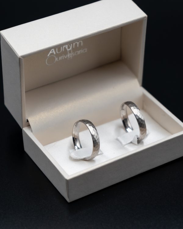 As alianças podem ser feitas em prata de lei (925), ouro de 9 k ou ouro de 19,25 k.