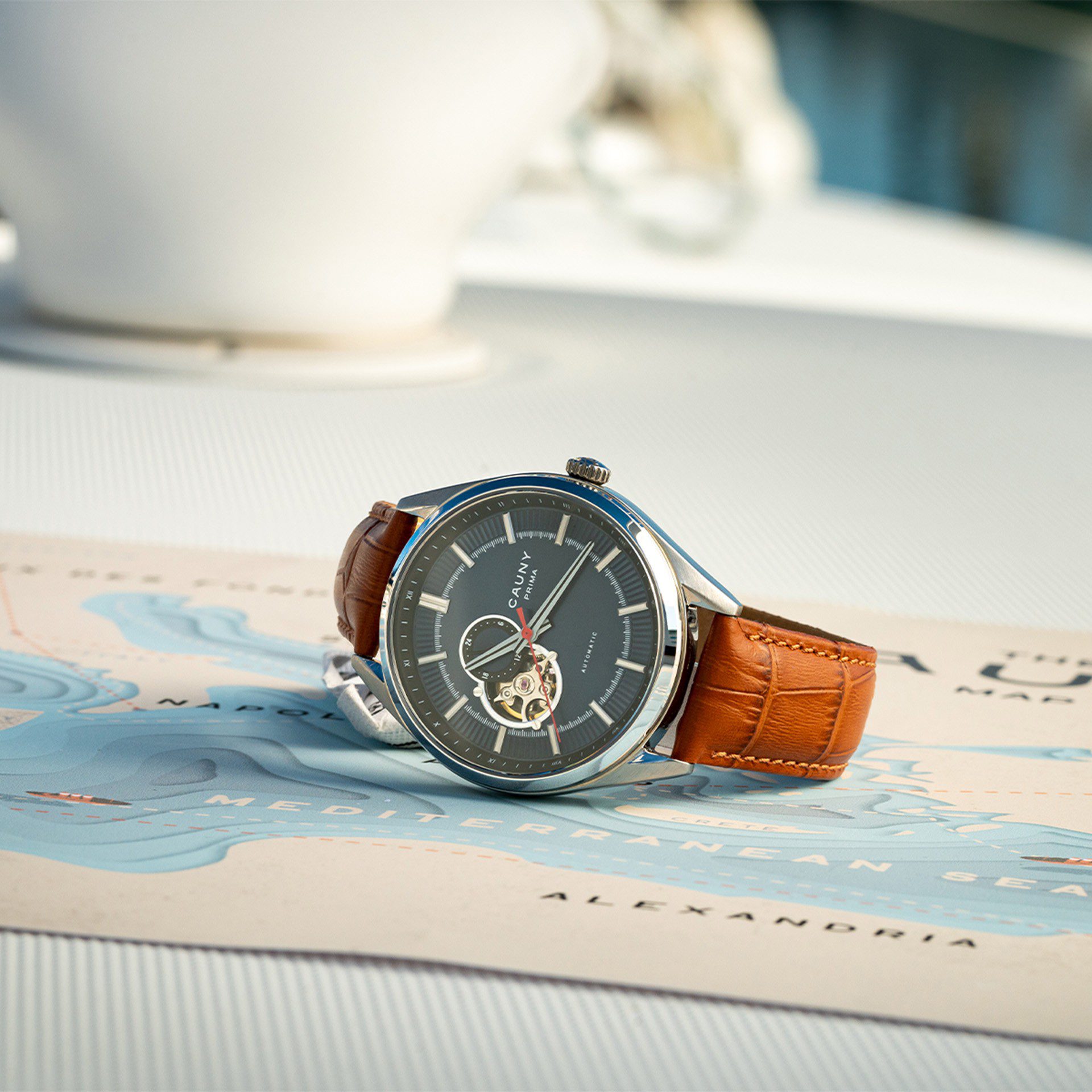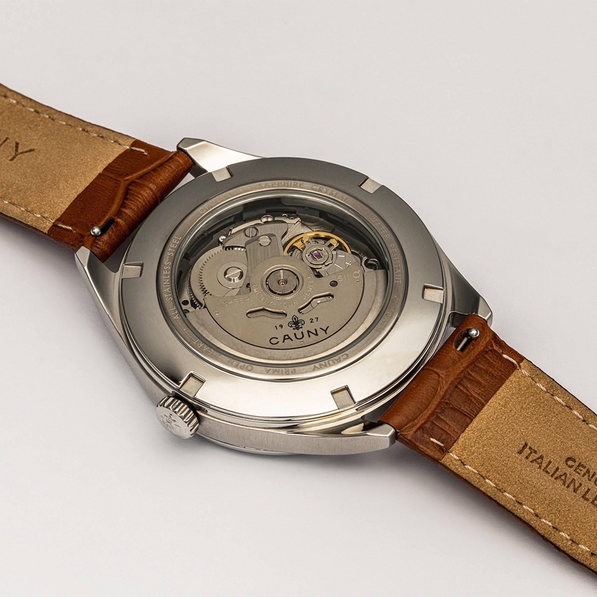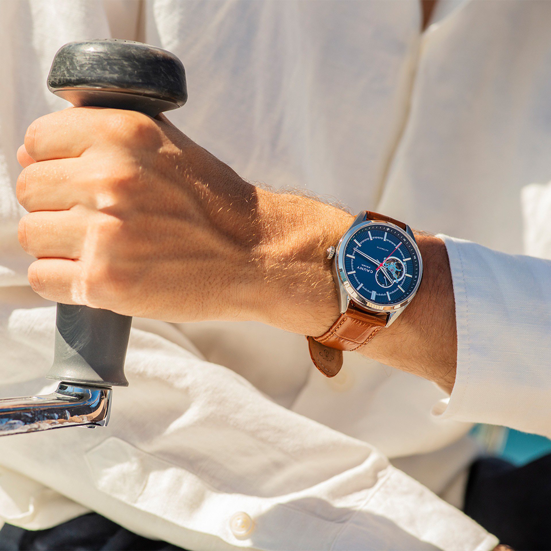 “Elegante e de espírito clássico, o Cauny Prima Open Heart Blue é a fusão perfeita entre estética moderna e altos padrões de relojoaria. Este automático de última geração destaca pela bracelete camel em pele italiana, o vidro em safira e o azul profundo do mostrador, reminiscente das travessias marítimas que caracterizam a história da Cauny. A elegante abertura Open Heart revela a beleza do mecanismo automático em movimento e faz deste um dos Automáticos mais deslumbrantes do mercado.”