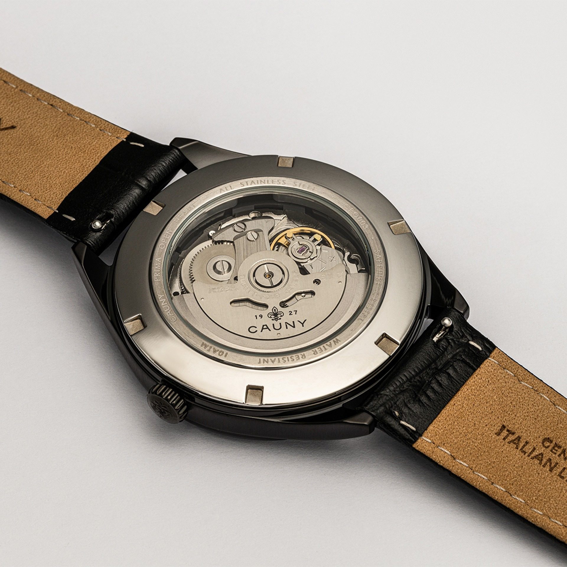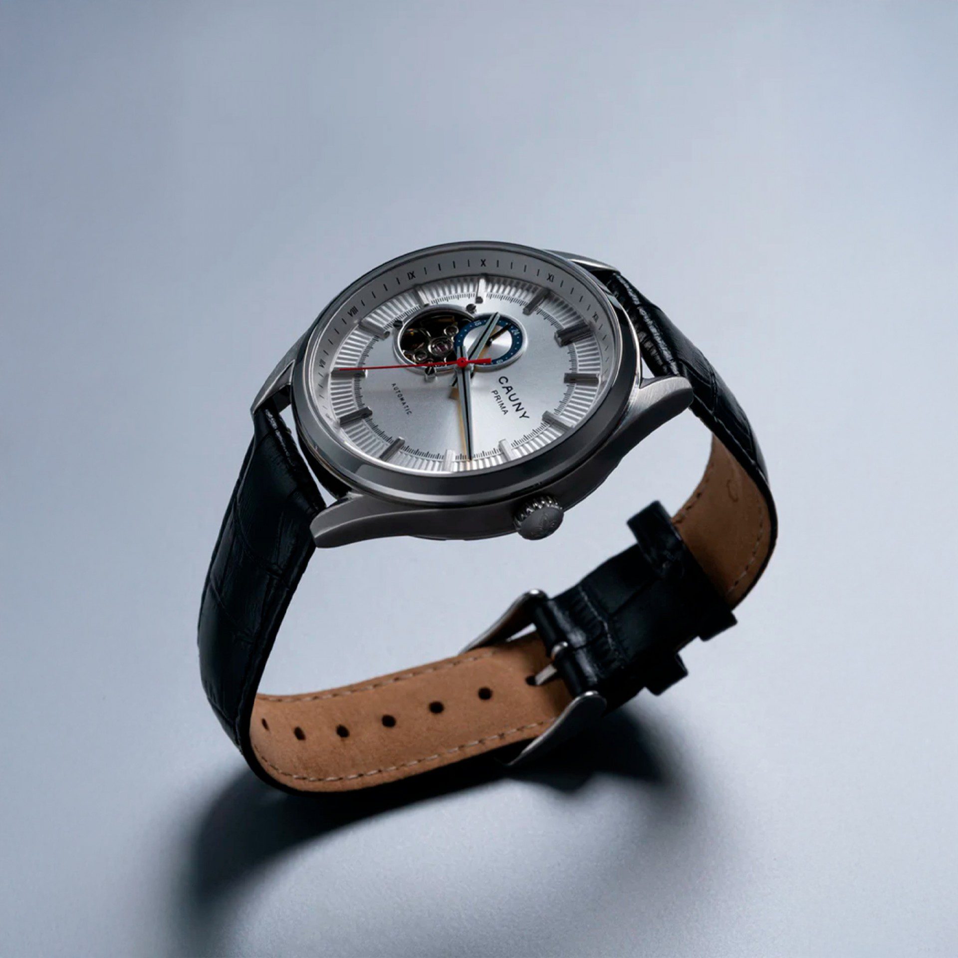 “Desenhado em tons de preto, o Cauny Prima Open Heart Black destaca-se pela sua simplicidade elegante. Com uma bracelete em pele italiana genuína negra e um mostrador preto com uma abertura Open Heart, este relógio automático com um vidro em safira é o complemento ideal para qualquer situação ou estado de espírito.”
