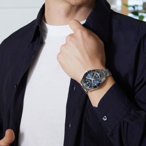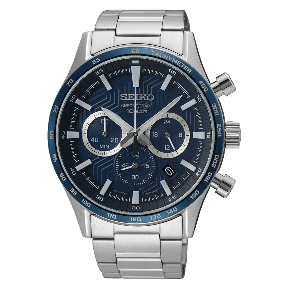 “Integrado na colecção Sports, o novo SSB445P1 foi concebido para quem tem um espírito desportivo e aventureiro. Com a sua caixa de 43 mm de diâmetro, este cronógrafo em aço é equipado com um movimento de quartzo de alta precisão, num mostrador com um padrão geométrico em azul.”
