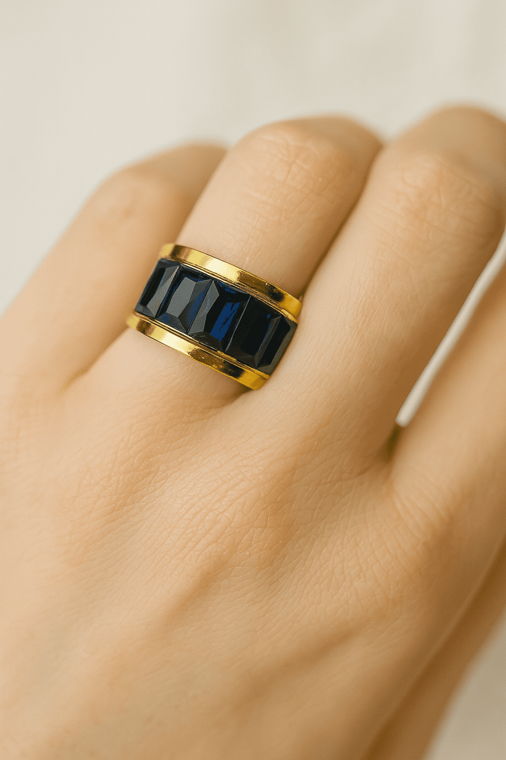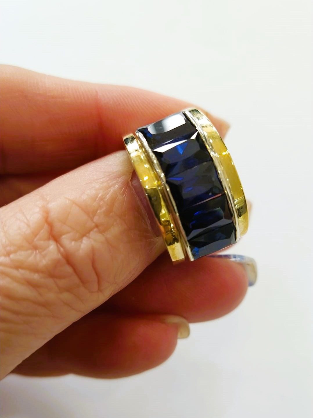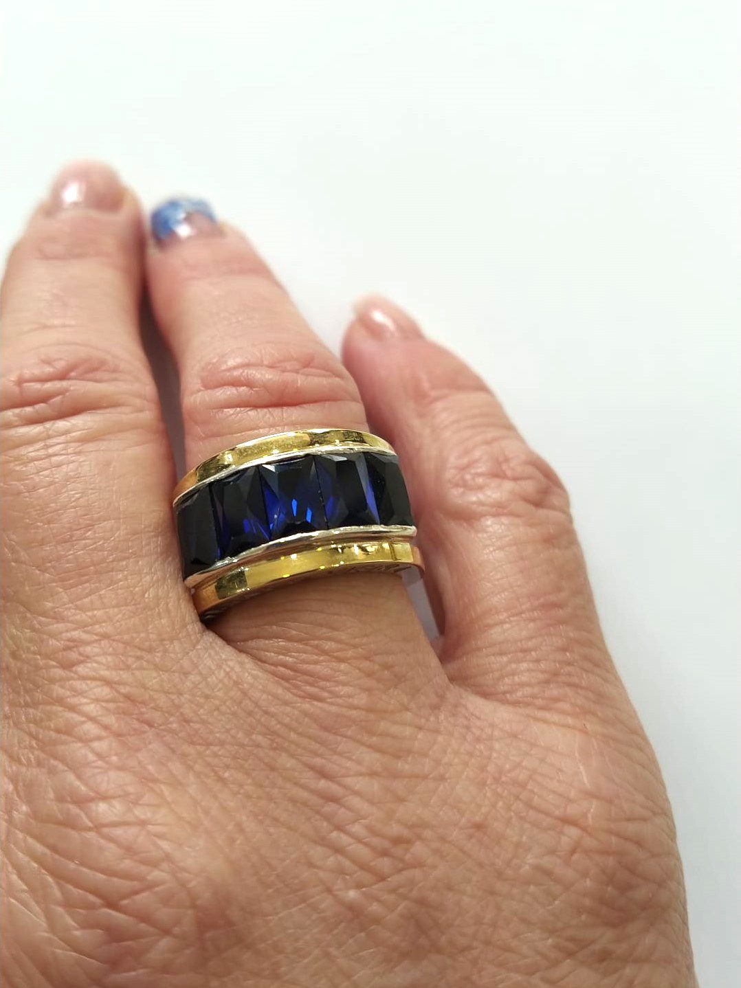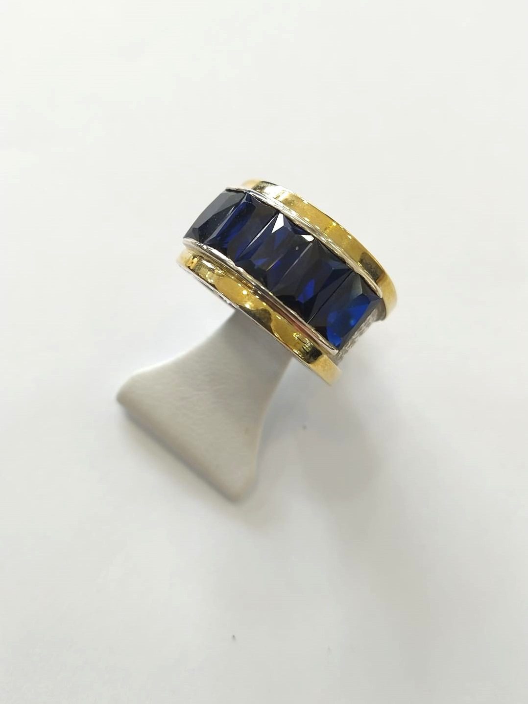 Anel em prata com cravação de baguetes coloração safira, encastradas em laterais de ouro amarelo.