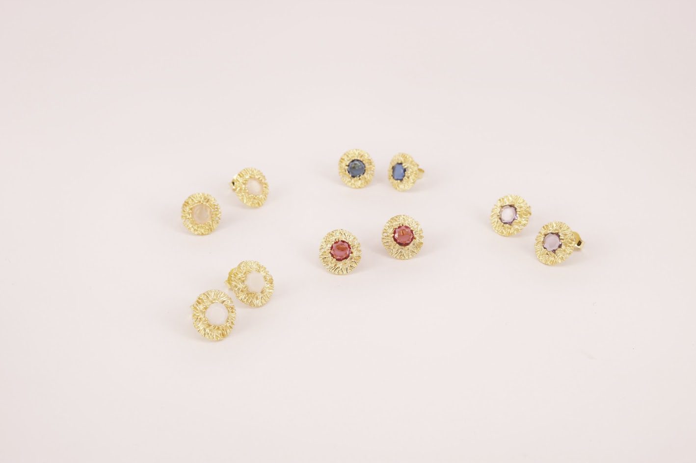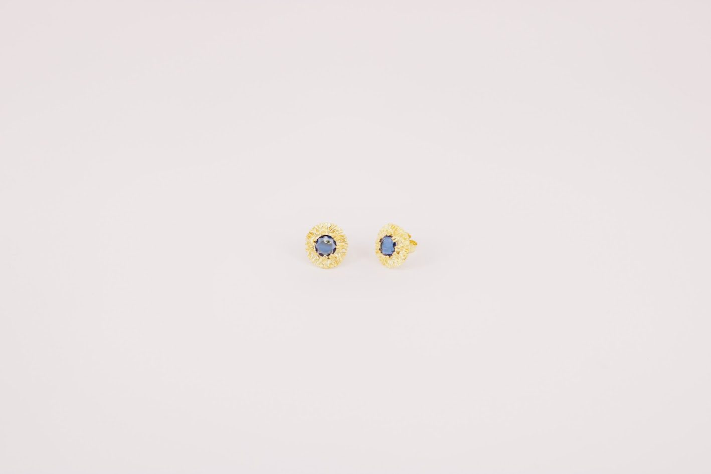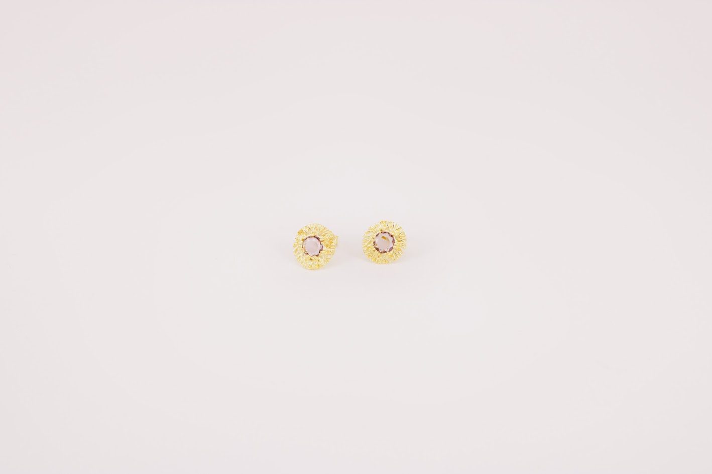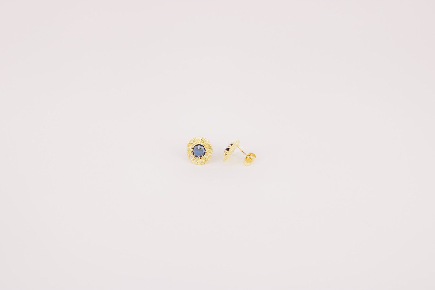 Brincos em prata de lei com peça redonda com efeito rendilhado com a inserção de uma pedra sintética redonda ao centro.