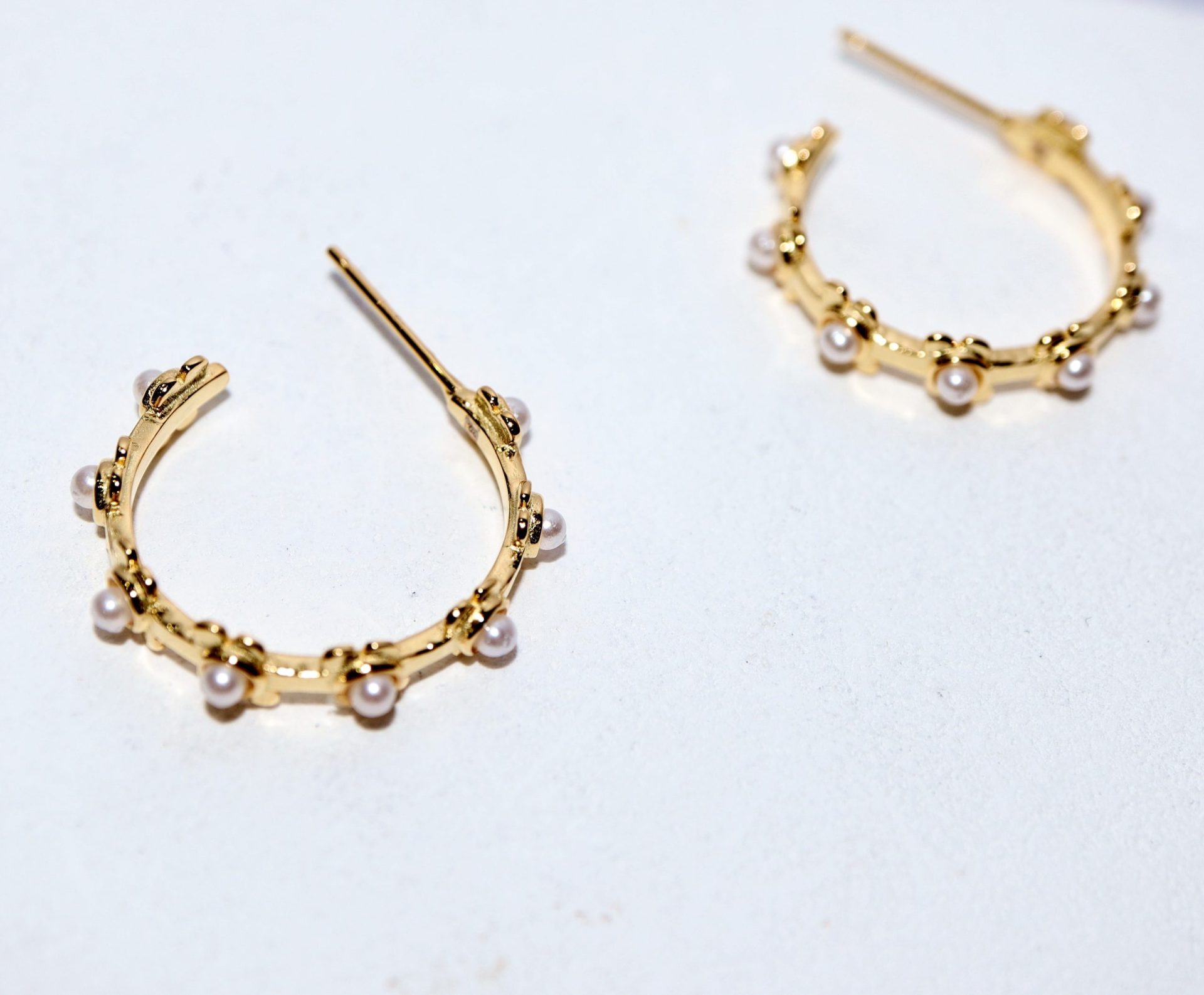 Brincos de tornilho com formato tipo argola. Feitio com mini florzinhas e pérolas.