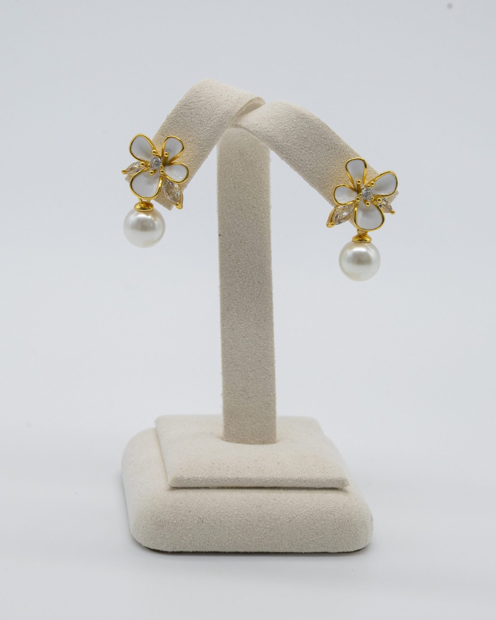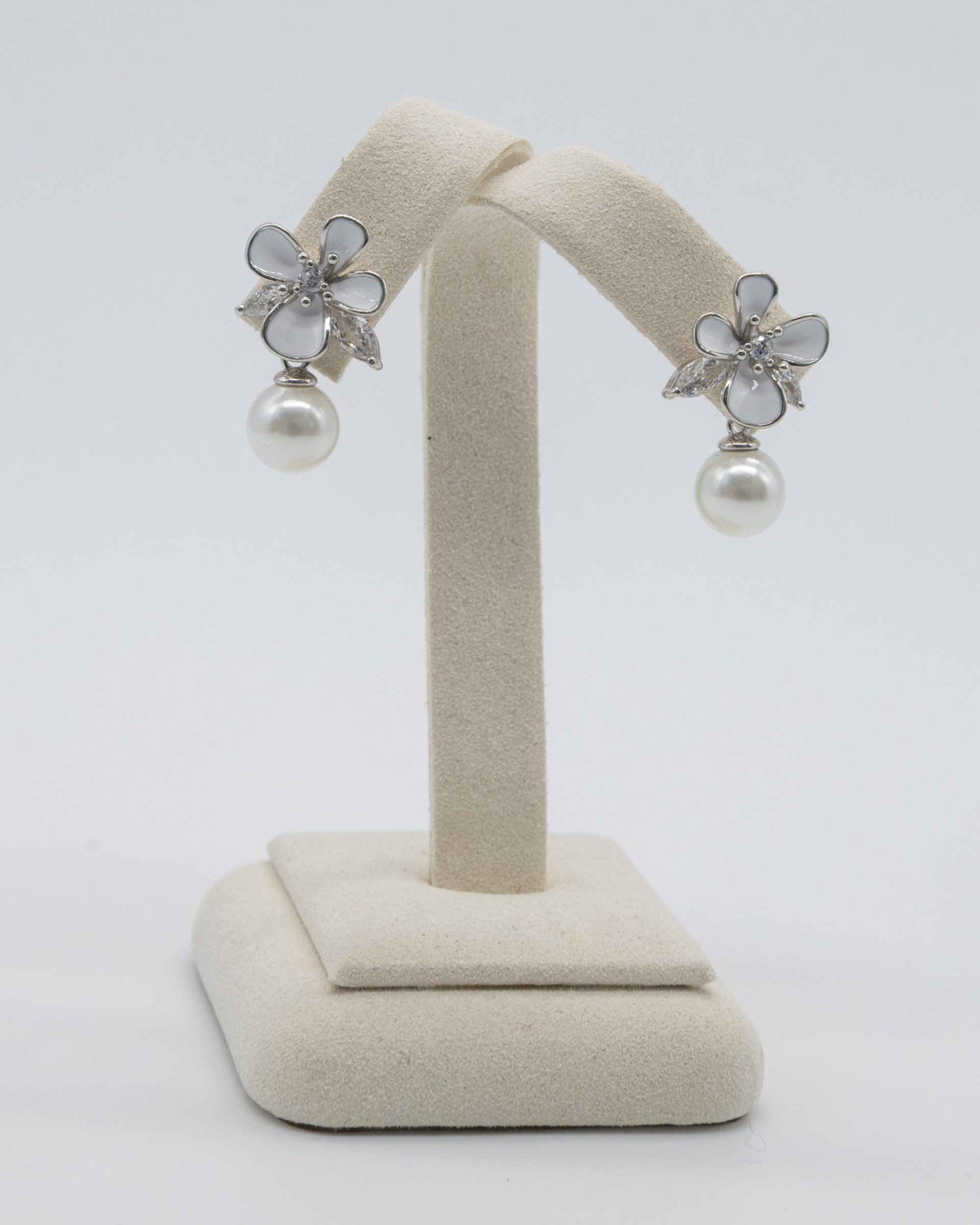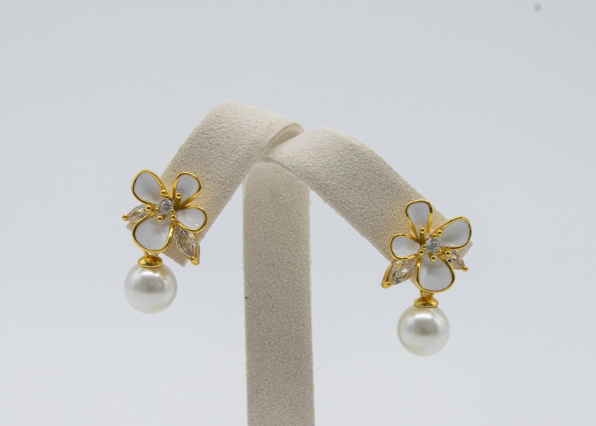 Brincos em prata em formato de flor. Pétalas esmaltadas a branco e duas zircónias em forma de navete cravadas nas laterais e uma zircónia redonda no centro da flor. A pérola (sintética) colocada na parte inferior movimenta-se consigo.