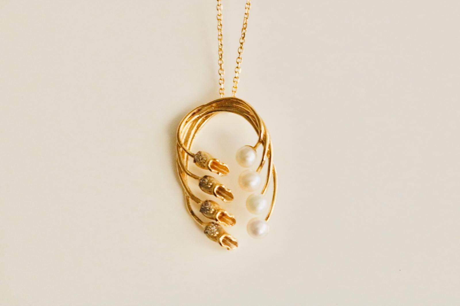 Colar com feitio floral-copo com pequenas zircónias no topo e três pérolas a sair dos outros ramos.