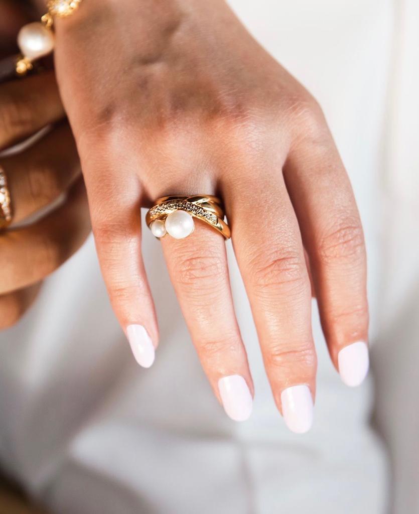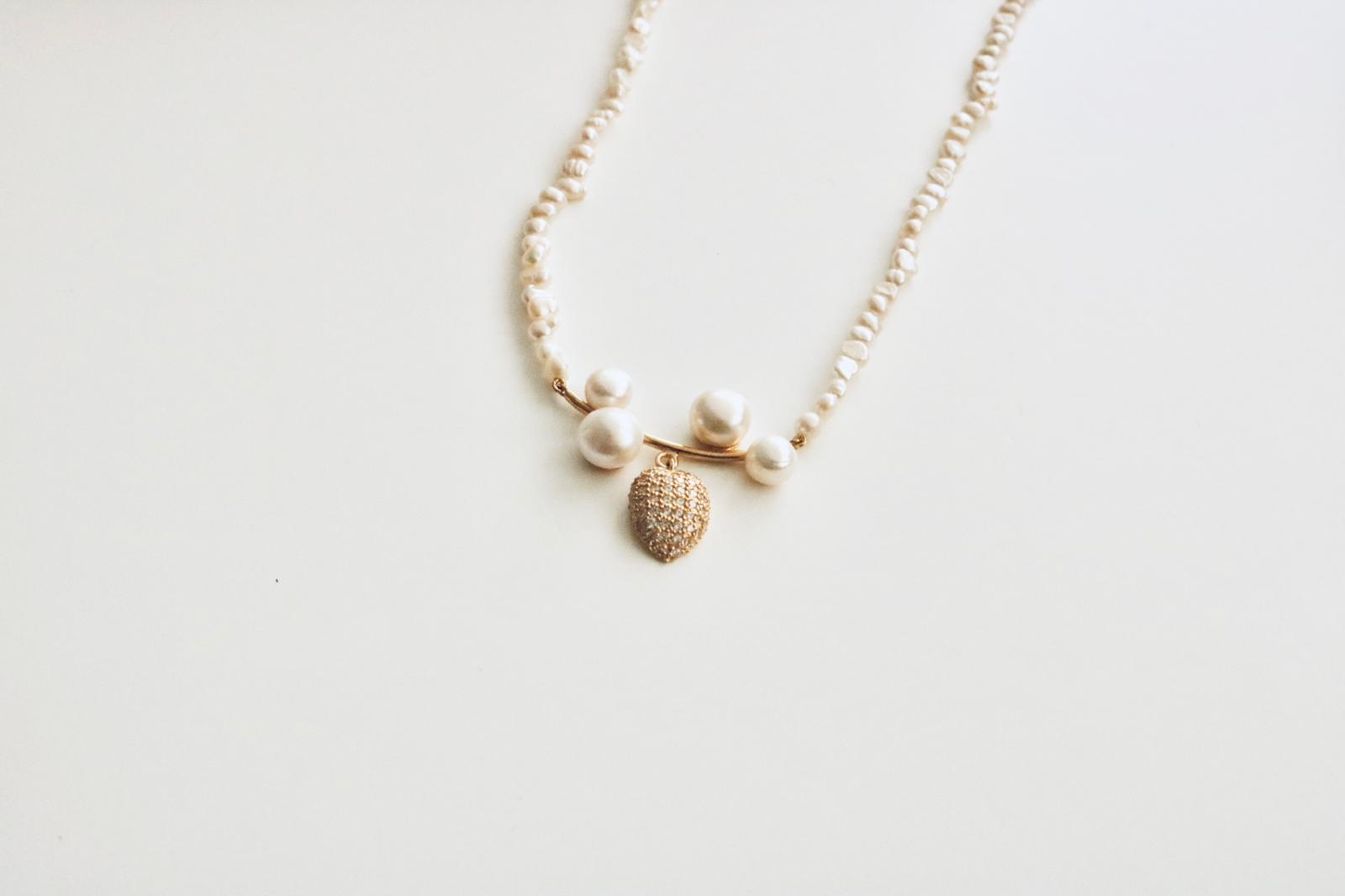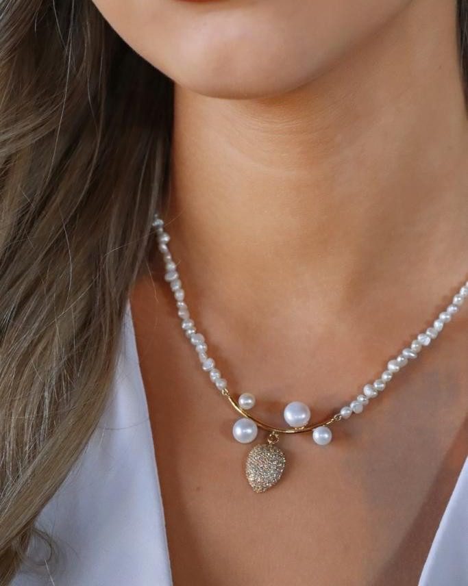 Colar e anel delicados com pérolas. Inspirado nas manhãs de orvalho, formando pequenas pérolas e uma folha cravada a zircónias.