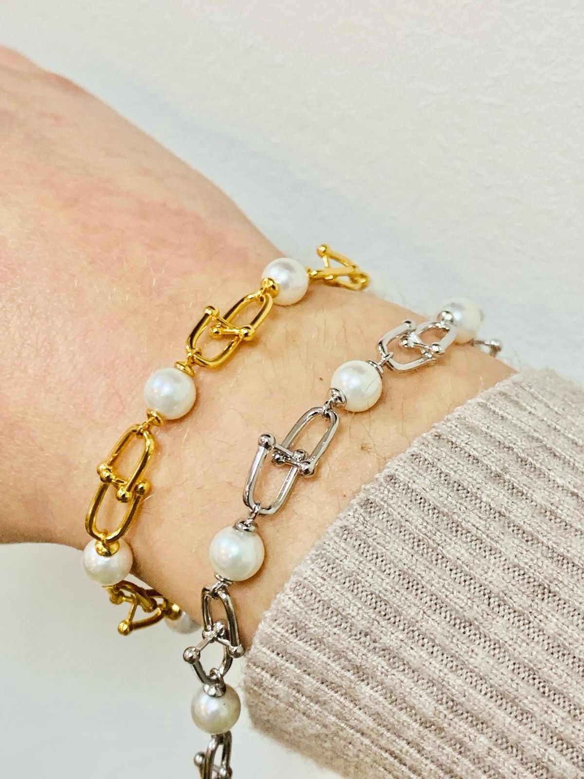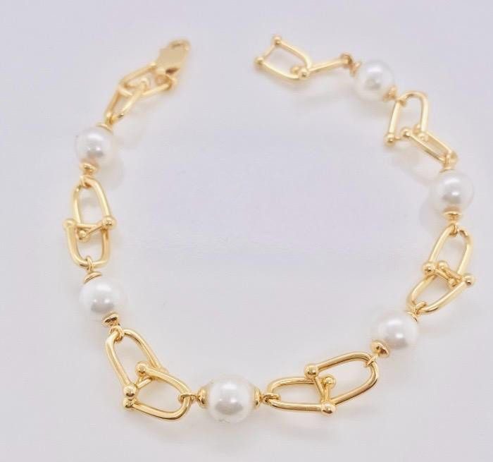 Pulseira com pérolas e elos a todo o comprimento.