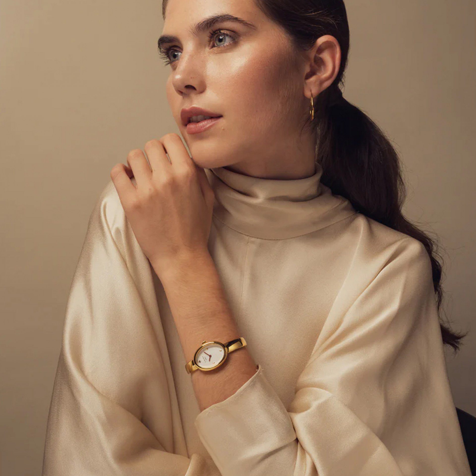 “O Cauny Amber capta a essência de uma joia moderna no pulso, definida por curvas suaves e uma silhueta escultural da pulseira. O mostrador branco com ponteiros bordeaux oferece um contraste subtil, mas marcante, realçando a arquitetura dourada da caixa e da bracelete.”