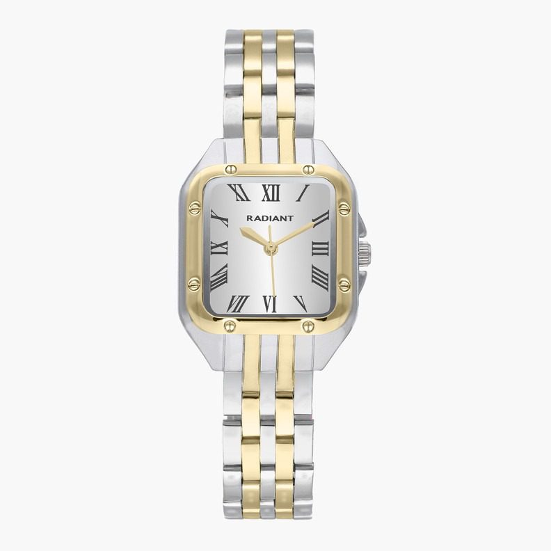 “Relógio RADIANT para mulher com caixa quadrada de 28 mm. Este relógio analógico todo conta com 3 ponteiros, movimento MIYOTA 2035 e resistência à água de 3 ATM. Com bracelete de 5 links este relógio está dotado de um design retro que nunca passa de moda.”