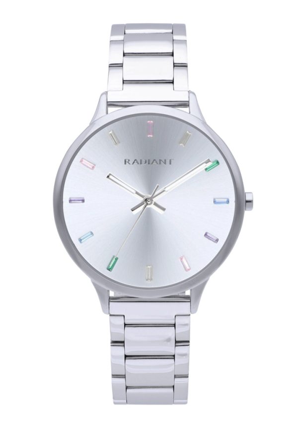“Relógio feminino RADIANT prateado com caixa de 38mm de diâmetro. Analógico de 3 ponteiros, com movimento MIYOTA 2035 e uma resistência à água de 3ATM. Os índices em forma de cristal baguete terminados em diferentes tons pastel são o que dá a esta coleção a #paixãopelosdetalhes de que tanto gostamos na Radiant.”