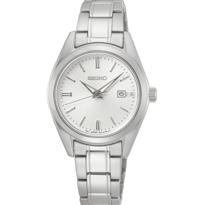 Relógio Seiko com movimento analógico, calibre 6N22, vidro de safira com mostrador de 29,8 mm, função de calendário. Fecho de borboleta com botão, sistema de Ajuste Easy Link. Bracelete e caixa prateadas.